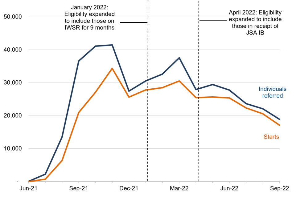 Number of individuals referred to, and starting on, the Restart Scheme each month between July 2021 and September 2022