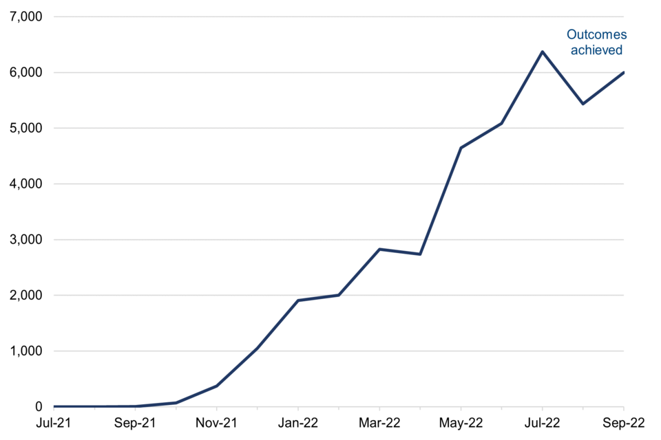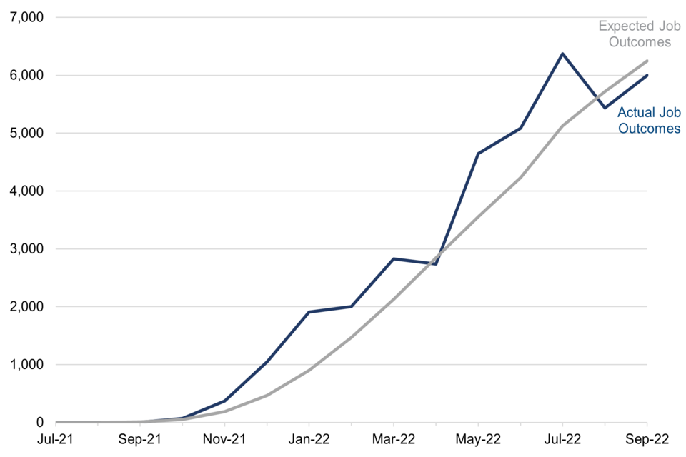 The number of job outcomes has been higher than expectations in most months since the programme’s launch, but has been lower than expectations in April, August, and September 2022