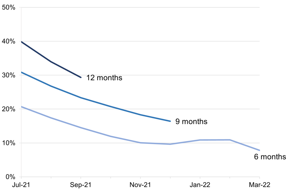 This graph shows the percentage of cohorts achieving a job outcome within 6 to 12 months on the programme and only shows cohorts that have spent at least this amount of time on the scheme. Whilst the 12-month measure is the key long-term measure, it is the least timely as we can currently only report it for cohorts that started up to September 2021.