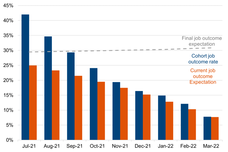 Job outcome rate against current job outcome expectation for cohorts that have had more than 6 months on the programme by start month, July 2021 to March 2022