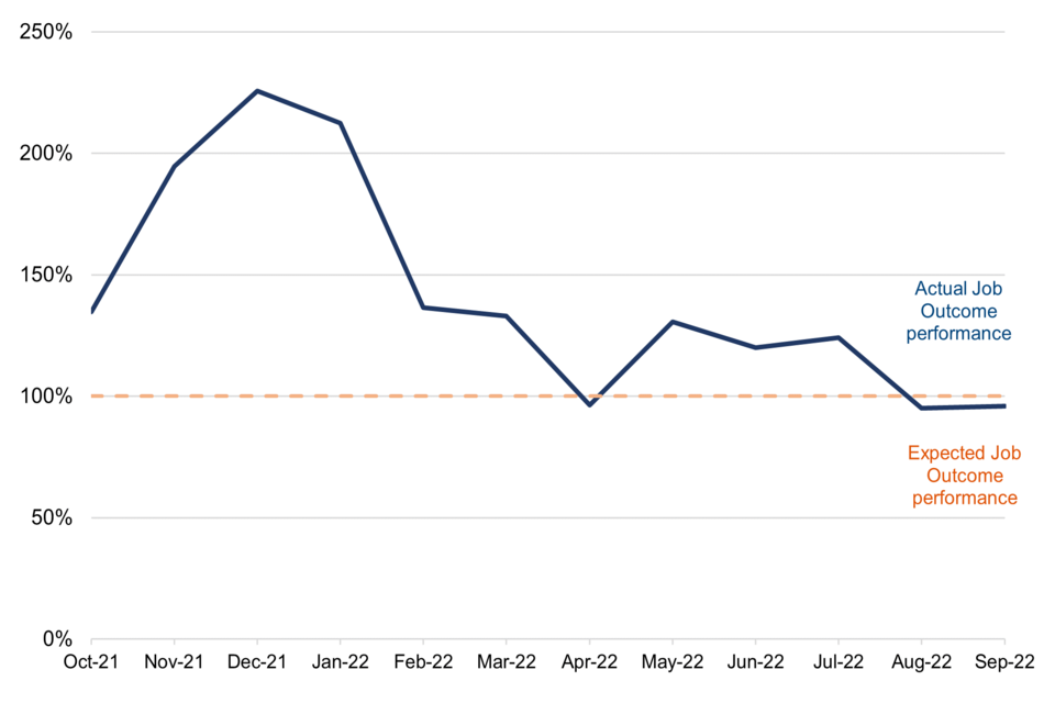 Note: The expected job outcome performance line shows where actual job outcomes achieved are equal to the expected number of job outcomes. Tracking of performance begins from October 2021 due to small volumes of job outcome expectations in the first 3 months of the scheme. Job outcomes are recorded according to the month in which the outcome definition is achieved. For example, the 120% figure for June 2022 indicates that, across all cohorts combined, the actual number of job outcomes for June 2022 was 120% of the expected number of job outcomes for this month.