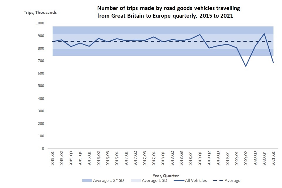 Between April to June 2020 and January to March 2021, levels fell below the expected variance, showing the extent to which, the coronavirus may have impacted the activity of road goods vehicles travelling from Great Britain to Europe, as well as the potential impact of leaving the EU. Intelligence from industry reports suggests that a few roll-on, roll-off ferry routes ceased operating during these time periods whilst others only carried unaccompanied trailers. A fall in activity was seen across most of the routes surveyed. However, with only one quarter of data available, and the on-going pandemic and recession, it is too early to assess the extent to which this reflects short-term trade disruption or longer-term supply chain adjustments.