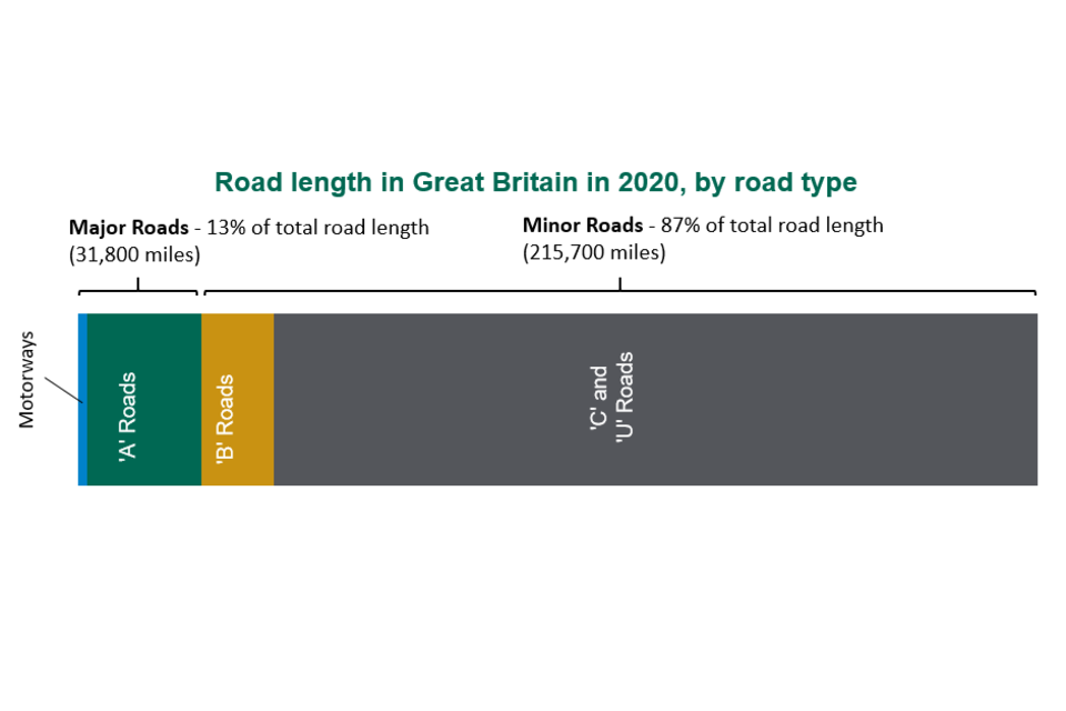 By length, most roads in Great Britain are managed locally (by a local highway authority or Transport for London). This includes all minor roads (‘B’, ‘C’ and ‘U’ roads), and some major roads (principal ‘A’ roads and motorways).
