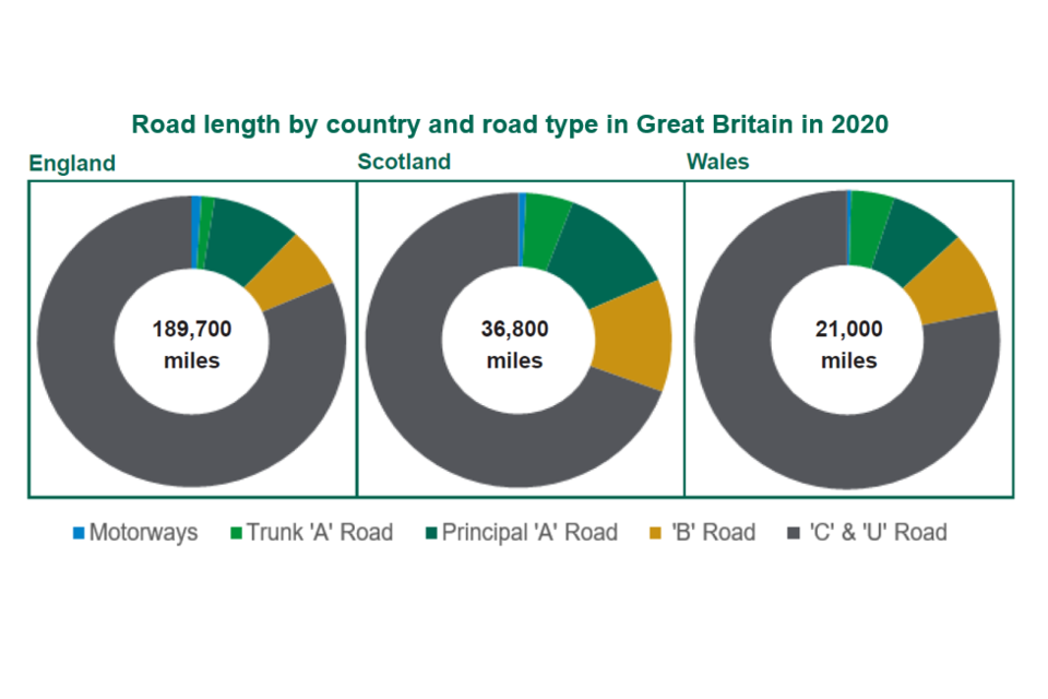 In 2020, a higher proportion of the road network in Scotland consisted of major roads (18%) compared with England (12%) and Wales (13%). A greater proportion of ‘A’ roads were classified as principal in England (87%) compared to Scotland (72%) and Wales (63%).