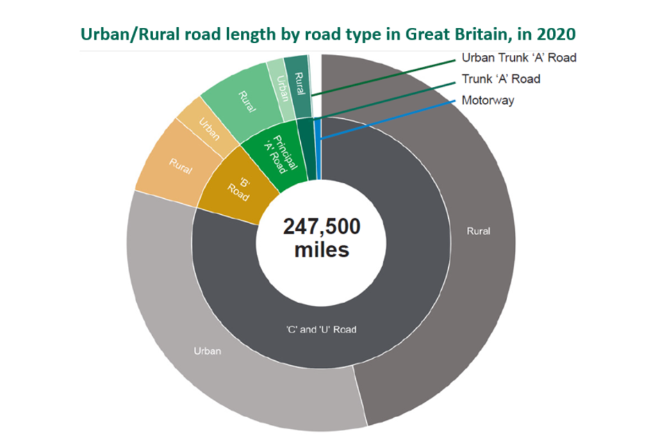 In 2020, the majority of road length in Great Britain was rural, with 76% of ‘A’ roads, 81% of ‘B’ roads, and 58% of the combined ‘C’ and ‘U’ roads classified in this way.