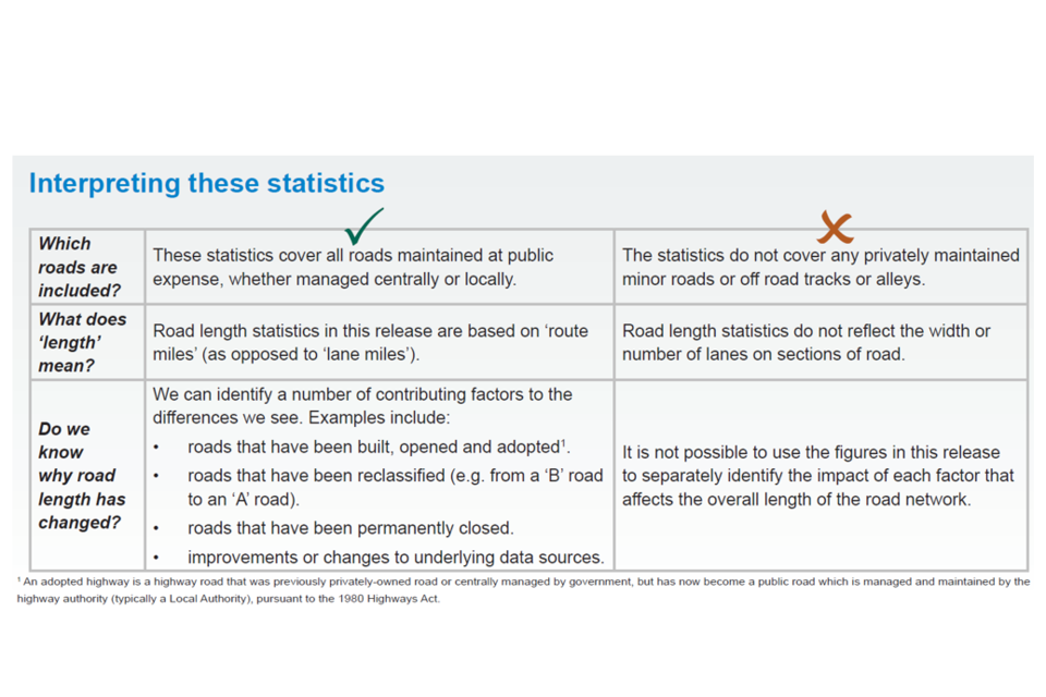 A table showing how to interpret these statistics. Essentially these statistics only cover roads maintained at public expense, whether managed centrally or locally