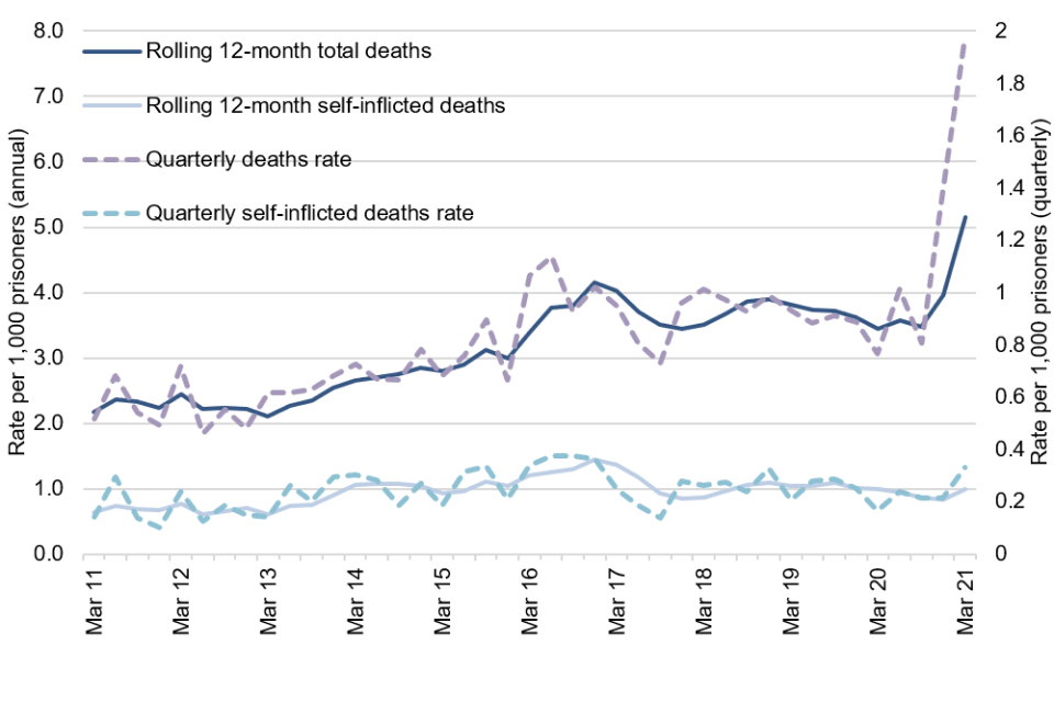 The most recent quarter saw the number of deaths increase by 45 to a record high total of 154 (an increase of 41%) in the three months to March 2021. This reflected a large increase in deaths from COVID-19 (further information below) and a smaller increase in self-inflicted deaths. There were 26 self-inflicted deaths in the first quarter of 2021, which was 9 more than in the previous quarter and 12 more than in the same quarter of 2021. However, quarterly death figures should be considered with caution due to greater volatility and the potential for seasonal effects.