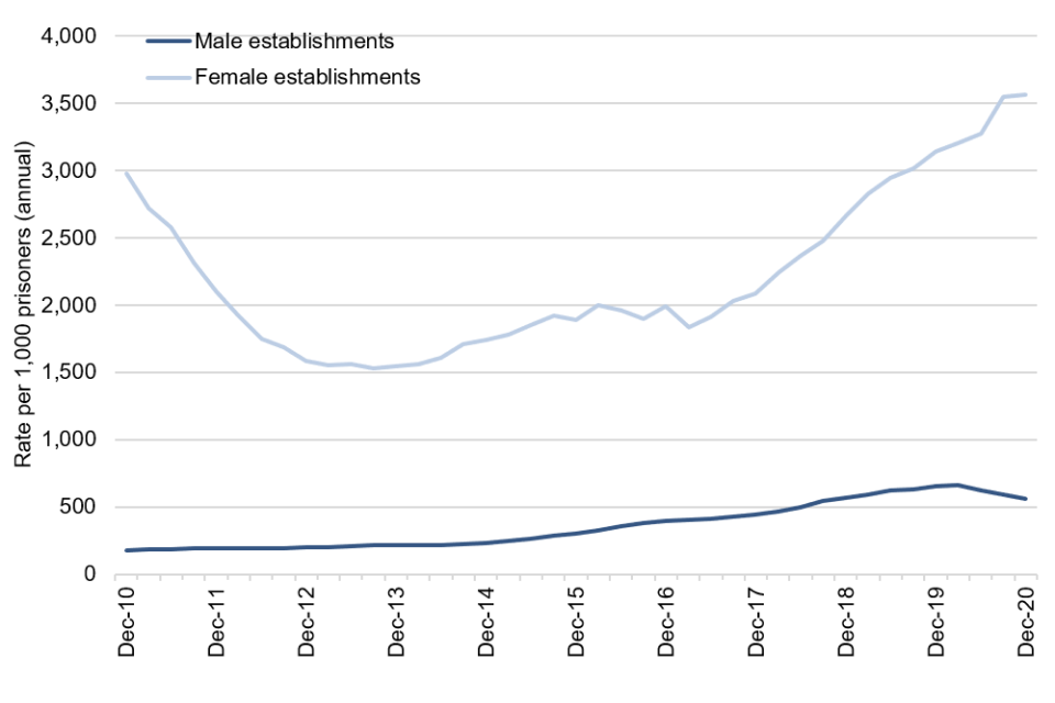 The rate of incidents, which takes population size into account, was 566 incidents per 1,000 prisoners in the male estate in the 12 months to December 2020, down 13% from 653 incidents per 1,000 prisoners in the 12 months to December 2019. The rate of incidents per 1,000 prisoners in female establishments was far higher, and increased by 13%, from 3,144 in the previous 12 months to 3,566 in the latest 12 months.
