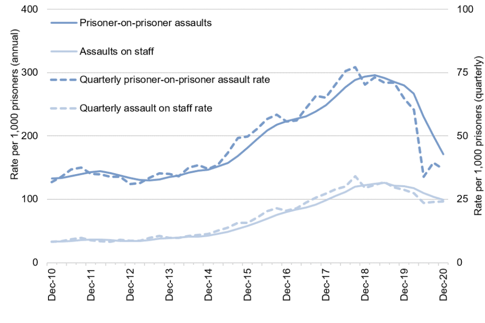 In the 12 months to December 2020, assault incidents decreased by 34% to 21,489, a rate of 267 incidents per 1,000 prisoners. This represents a decrease in the rate of assault per 1,000 prisoners (which takes into account the decrease in the prison population over the period) of a similar extent, 32%. In the latest quarter, there were 4,738 assaults, a decrease of 4% from the previous quarter. The quarterly figure reached a peak of 9,111 in the July to September 2018 quarter. It has continued on a downward trend since then.
