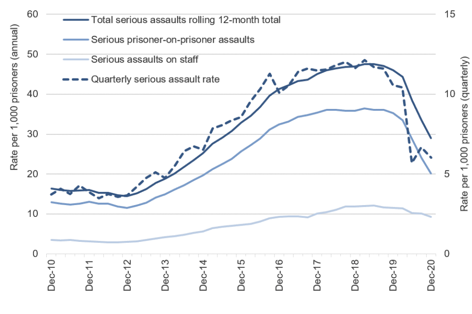 In the 12 months to December 2020, there were 2,328 serious assaults (a rate of 29 per 1,000 prisoners), a 39% decrease from the previous 12 months. The rate of serious assault decreased to a similar extent, by 37%. In the latest quarter, there were 475 serious assaults, a 10% decrease from the previous quarter. In the latest 12 months, 11% of assaults were serious assaults.