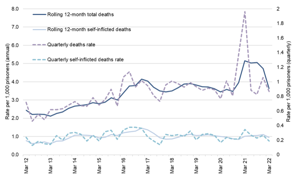 | Number of deaths decreased from the previous 12-month period | In the 12 months to March 2022, there were 287 deaths in prison custody, a decrease of 29% from 407 deaths in the previous 12 months which reflects a reduction in the number of deaths related to Covid-19. There were 75 self-inflicted deaths, a decrease of 6% from 80 in the previous 12 months. In the most recent quarter there were 69 deaths, an 18% decrease from 84 deaths in the previous quarter. |