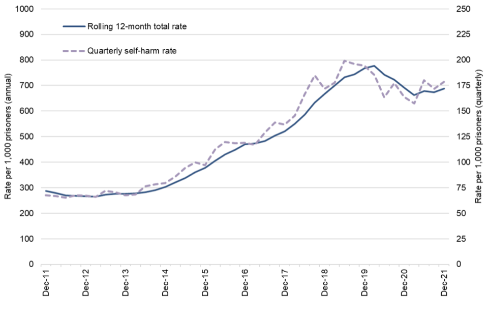 In the 12 months to December 2021, there were 54,027 reported incidents of self-harm (a rate of 688 per 1,000 prisoners), down 3% from the previous 12 months. On a quarterly basis, the number of incidents in the three months to December 2021 increased by 5% from the previous quarter, from 13,612 to 14,282 incidents.