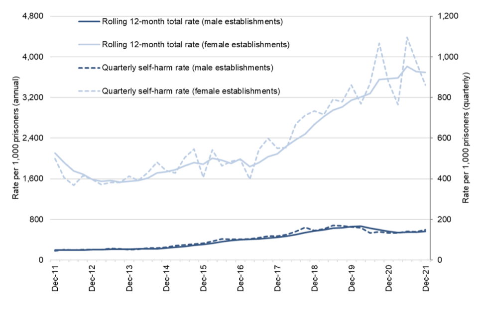 Figure 3: Quarterly 12-month rolling rate of self-harm incidents per 1,000 prisoners by gender of establishment, 12 months ending December 2011 to 12 months ending December 2021