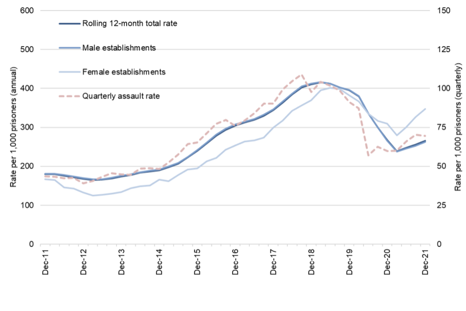 | The rate of assault per 1,000 prisoners was higher in female than male establishments. | The rate of assault in male establishments decreased by 2% from the previous 12 months, while the rate in female establishments increased by 12%. Assault rates for the 12 months to December 2021 were higher in female establishments (347 incidents per 1,000 prisoners) than in male establishments (262 incidents per 1,000 prisoners). |