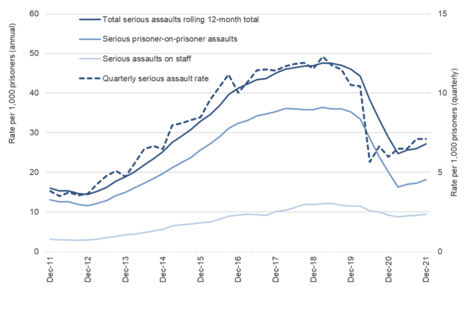 In the 12 months to December 2021, there were 2,137 serious assaults (a rate of 27 per 1,000 prisoners), an 8% decrease from the previous 12 months. The rate of serious assault decreased to a slightly lesser extent, by 7%. In the latest quarter, there were 568 serious assaults, a 1% increase from the previous quarter. In the latest 12 months, 10% of assaults were serious assaults.