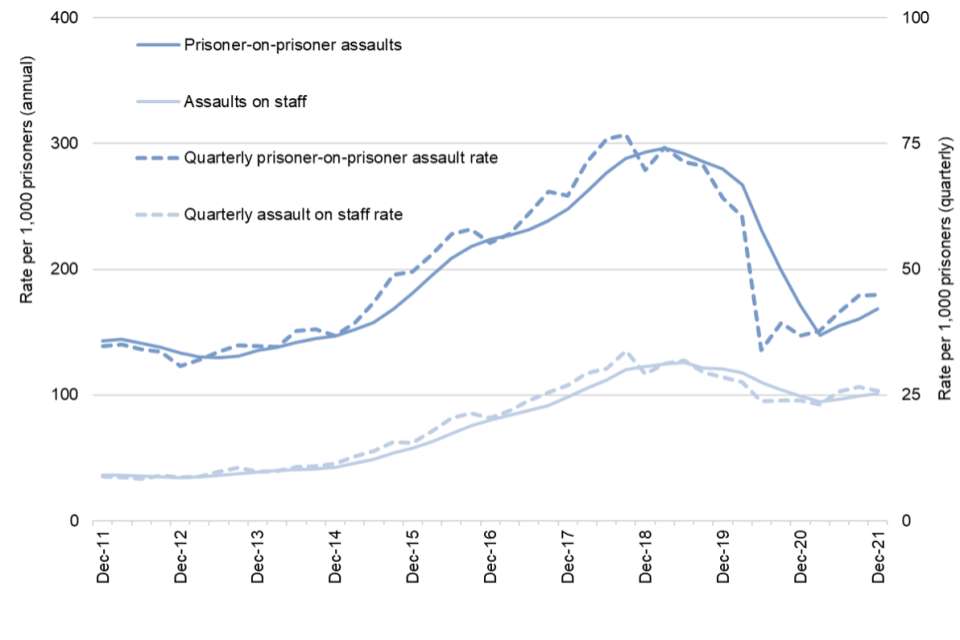 There were 13,259 prisoner-on-prisoner assaults[footnote 12] in the 12 months to December 2021 (a rate of 169 per 1,000 prisoners). This is a decrease of 4% from the 13,805 assaults in the previous 12 months. The rate of prisoner-on-prisoner assault per 1,000 prisoners decreased to a lesser extent, by 2%. In the latest quarter, there were 3,595 prisoner-on-prisoner assaults, a 2% increase from 3,541 in the previous quarter.
