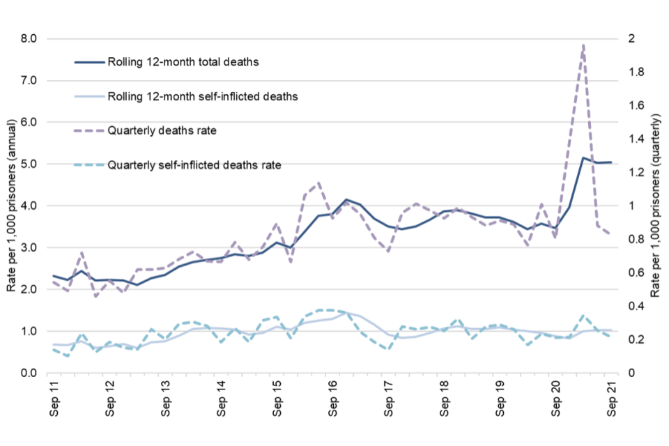 In the 12 months to September 2021, there were 396 deaths in prison custody (a rate of 5.1 per 1,000 prisoners), an increase from 283 deaths in the previous 12 months (a rate of 3.5 per 1,000 prisoners). Long-term trends and more detail are presented in the annual tables[footnote 7].