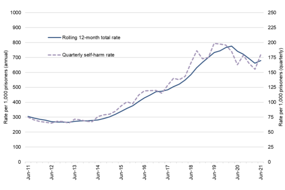 In the 12 months to June 2021, there were 53,290 reported incidents of self-harm (a rate of 679 per 1,000 prisoners), down 13% from the previous 12 months. On a quarterly basis, the number of incidents in the three months to June 2021 increased by 16% from the previous quarter, from 12,126 to 14,007 incidents.