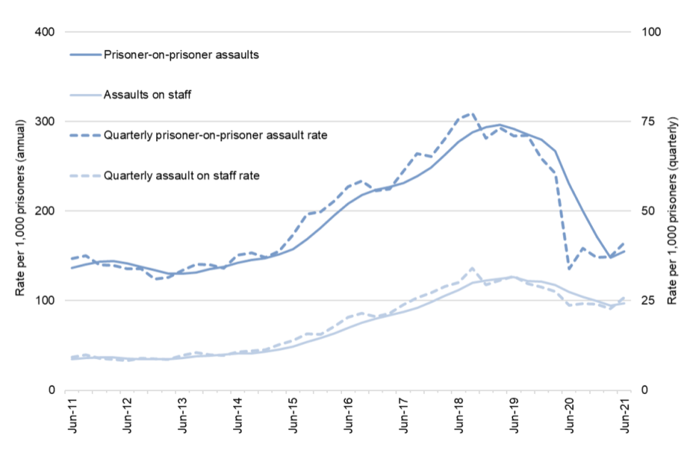 There were 12,181 prisoner-on-prisoner assaults[footnote 8] in the 12 months to June 2021 (a rate of 155 per 1,000 prisoners). This is a decrease of 36% from the 19,056 assaults in the previous 12 months. The rate of prisoner-on-prisoner assault per 1,000 prisoners decreased to a lesser extent, 33%. In the latest quarter, there were 3,222 prisoner-on-prisoner assaults, an 11% increase from 2,901 in the previous quarter.