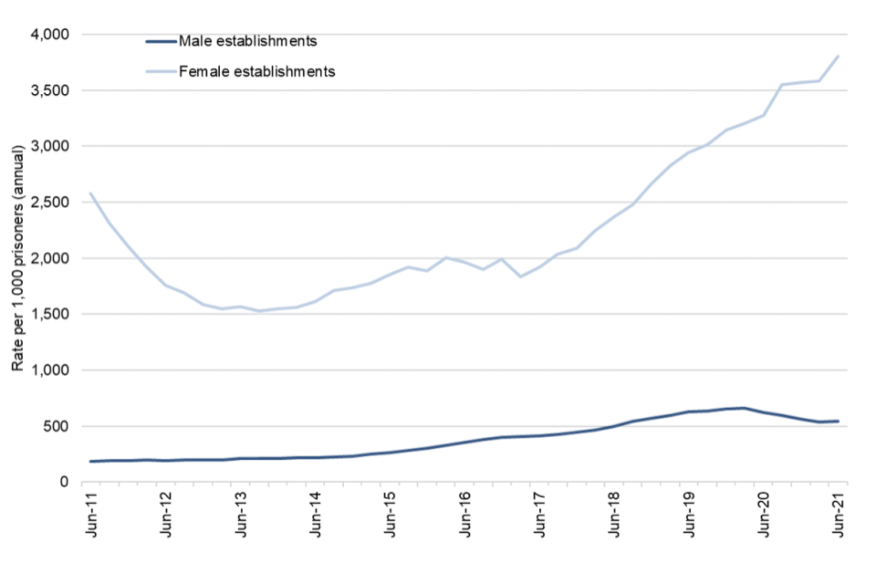 In female establishments, prisoner-on-prisoner assaults decreased by 34% to 427 incidents (134 incidents per 1,000 female prisoners), and the rate decreased by 24% in the 12 months to June 2021. Assaults on staff decreased by 8% to 540 incidents (169 incidents per 1,000 female prisoners) compared to the previous 12 months, but the rate increased by 5%.