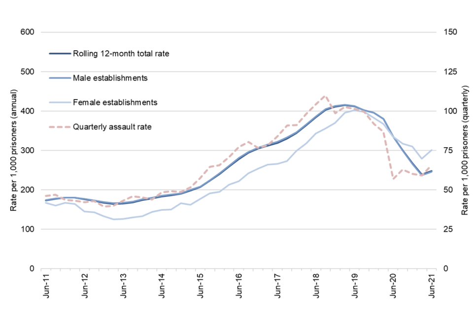 | The rate of assault per 1,000 prisoners was higher in female than male establishments. | The rate of assault in male establishments decreased by 27% from the previous 12 months, while the rate in female establishments decreased by 10%. This resulted in assault rates for the 12 months to June 2021 being higher in female establishments (301 incidents per 1,000 prisoners) than in male establishments (246 incidents per 1,000 prisoners). |