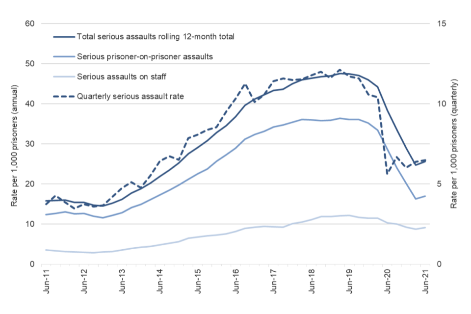 | Of the 19,470 assault incidents, 2,009 (10%) were serious. | In the 12 months to June 2021, there were 2,009 serious assault incidents, a 37% decrease from the previous 12 months. The rate of serious assault decreased to a lesser extent, by 32% (taking account of decreases in population size over the period). Serious prisoner-on-prisoner assaults decreased by 44% to 1,332 in the 12 months to June 2021, and serious assaults on staff decreased by 16% to 717. |