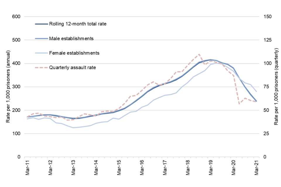 The number of incidents in male establishments decreased by 40% from 30,189 to 17,995 in the 12 months to March 2021. The rate of assaults decreased to a similar extent over this period, by 38% to 237 per 1,000 prisoners.