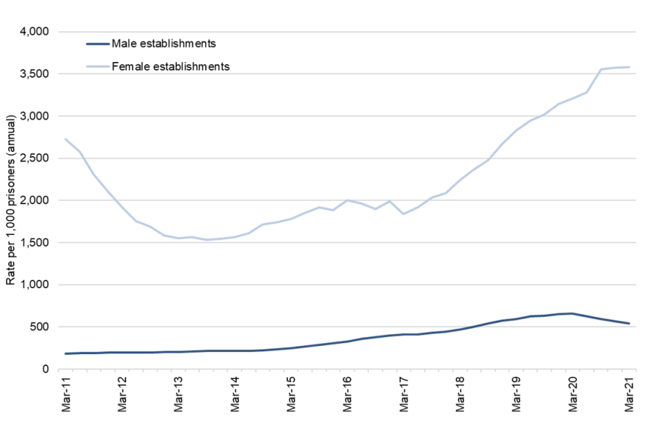 | The rate of assault per 1,000 prisoners was higher in female than male establishments. | The rate of assault in male establishments decreased by 38% from the previous 12 months, while the rate in female establishments decreased by 24%. This resulted in assault rates for the 12 months to March 2021 being higher in female establishments (279 incidents per 1,000 prisoners) than in male establishments (237 incidents per 1,000 prisoners). |