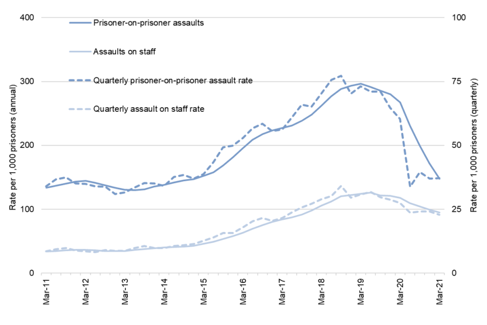 | Assaults on staff have decreased | There were 7,479 assaults on staff in the 12 months to March 2021, down 24% from the previous 12 months. In the latest quarter the number of assaults decreased by 6% to 1,778 incidents. |