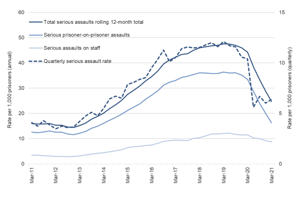 In the 12 months to March 2021, there were 1,954 serious assaults (a rate of 25 per 1,000 prisoners), a 47% decrease from the previous 12 months. The rate of serious assault decreased to a slightly lesser extent, by 43%. In the latest quarter, there were 499 serious assaults, a 5% increase from the previous quarter. In the latest 12 months, 10% of assaults were serious assaults.