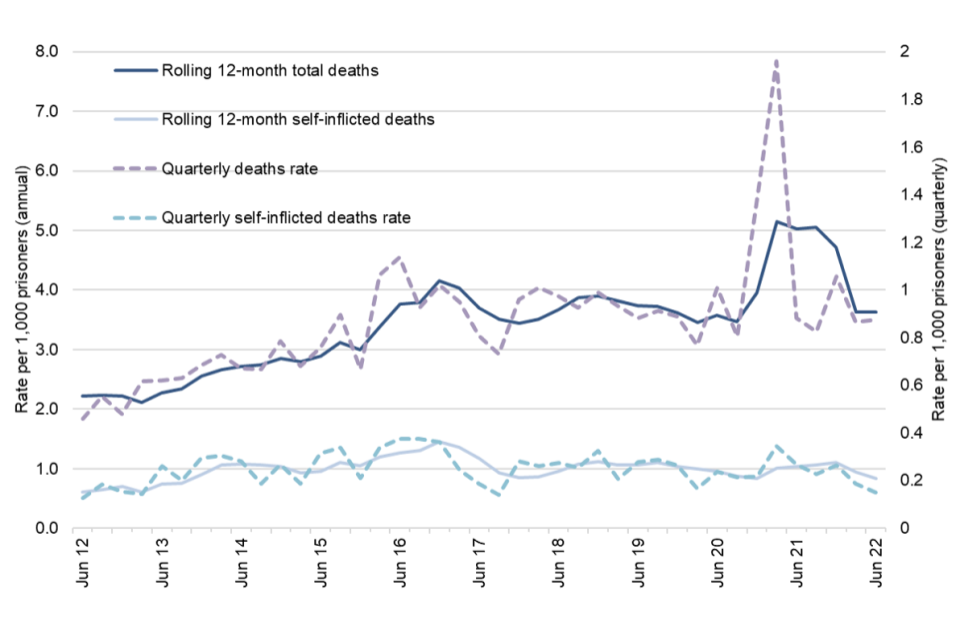 In the 12 months to June 2022, there were 288 deaths in prison custody (a rate of 3.6 per 1,000 prisoners), a decrease from 395 deaths in the previous 12 months (a rate of 5.0 per 1,000 prisoners). Long-term trends and more detail are presented in the annual tables[footnote 6].
