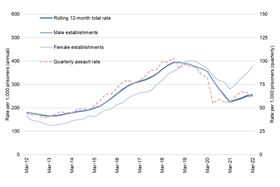 | The rate of assault per 1,000 prisoners was higher in female than male establishments. | The rate of assault in male establishments increased by 12% from the previous 12 months, while the rate in female establishments increased by 35%. Assault rates for the 12 months to March 2022 were higher in female establishments (377 incidents per 1,000 prisoners) than in male establishments (250 incidents per 1,000 prisoners). |