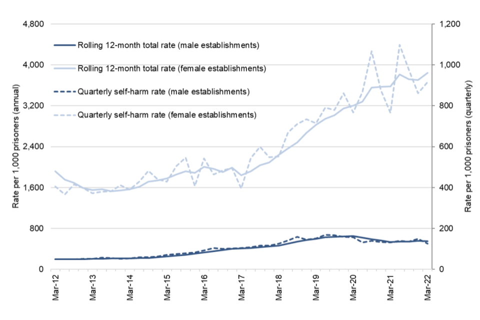 The rate of self-harm incidents has increased in the 12 months to March 2022, by 4%, comprising increases of 3% in male establishments and 7% in female establishments compared with the previous year (similar increases were seen in the volumes of incidents, reflecting that the average prison population was similar across 2020/21 and 2021/22, as set out in Offender Management Statistics Quarterly).