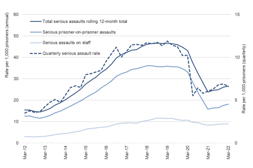 There were 1,420 serious prisoner-on-prisoner assaults (a rate of 18 per 1,000 prisoners) in the 12 months to March 2022, a 14% increase from the previous 12 months although remaining 48% lower than the 2,730 incidents in the 12 months to March 2020, pre-pandemic. The rate of serious prisoner-on-prisoner assaults in the latest 12 months was 14% higher than in the previous 12 months but 45% lower than in the 12 months to March 2020. In the latest quarter, there were 357 serious prisoner-on-prisoner assaults, a 7% decrease from 382 incidents in the previous quarter.