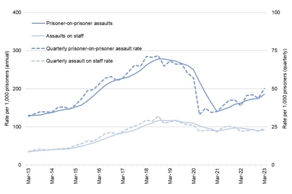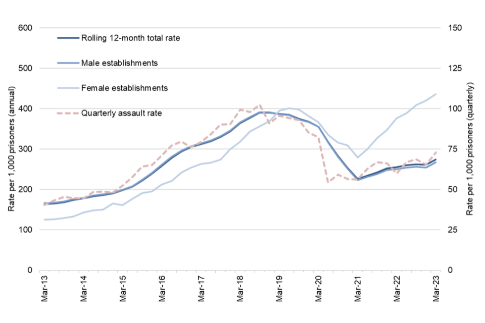 In the 12 months to March 2023, assault incidents increased by 11% to 22,319 (a rate of 274 incidents per 1,000 prisoners). The rate of assaults in the latest 12 months was 7% higher than in the previous 12 months.