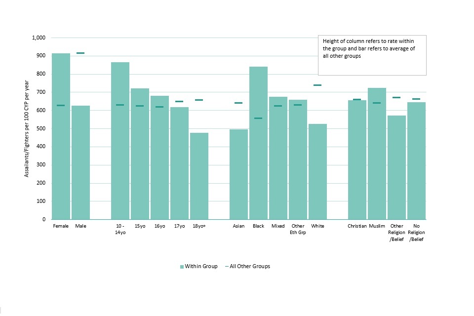 In terms of protected characteristics, the rates of involvement as an assailant or fighter over the 12 months to 31st December 2022 were higher than other groups for girls at 914 per 100 CYP per year, for 10 to 14 year-olds at 864 per 100 CYP; for CYP from a black background at 842 per 100 CYP, and for Muslims at 725 per 100 CYP.