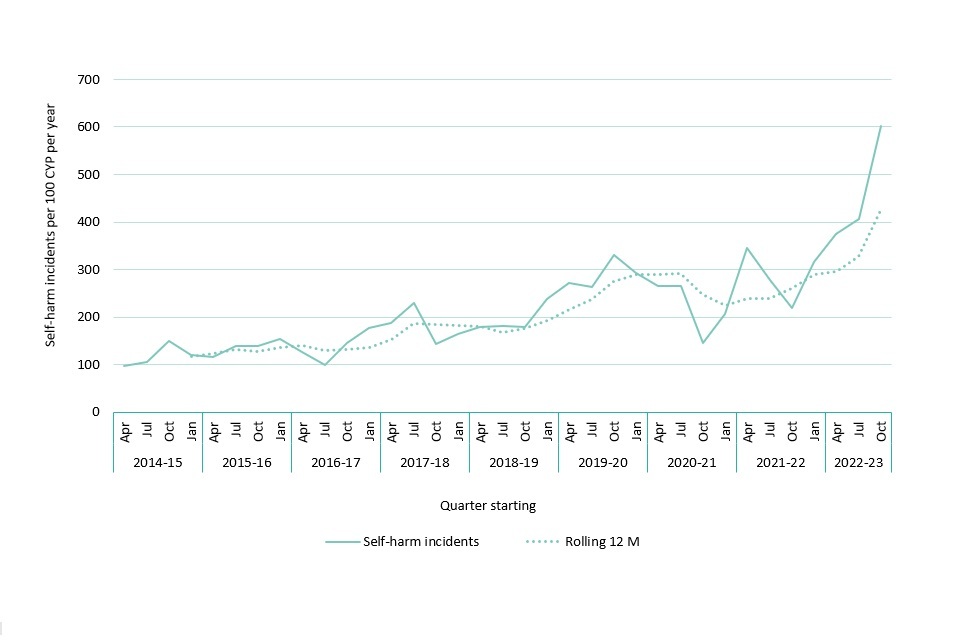 In the 3 months October to December 2022 there were 719 incidents of self-harm involving 66 different CYP. The annualised rate was 602 incidents per 100 CYP per year, an increase of 176% compared to the same period last year.