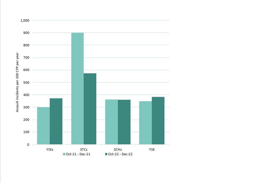 The rate of assault incidents during the 3 months October to December 2022 increased in the YOI sector, decreased in the STC sector, and was broadly similar in the SCH sector when compared to the same period last year.