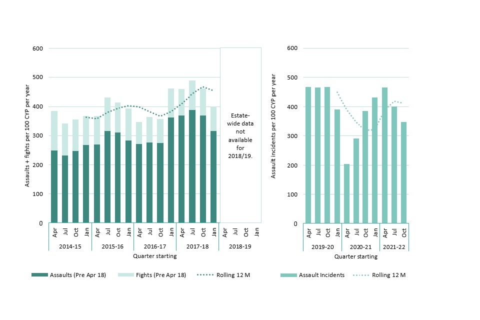 In the 3 months October to December 2022, there were 459 assault incidents in the Children and Young People Secure Estate (CYPSE) involving 346 different children and young people (CYP) as assailants or fighters. The annualised rate of assault incidents was 384 per 100 CYP per year, an increase of 11% compared to the same period in 2021 when the rate was 347 per 100 CYP per year.