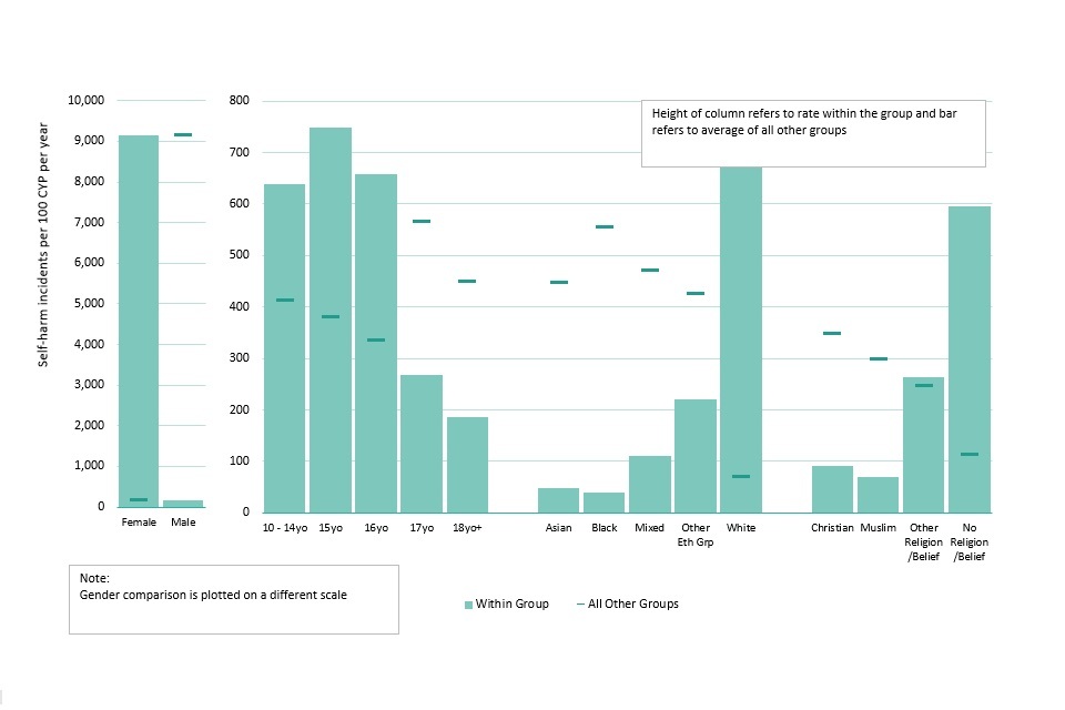 The following groups have a high rate of self-harm: girls, 15 year-olds, white ethnic groups and those with no religion. The rate of self-harm among girls across the whole Children and Young People Secure Estate in the 12 months ending 31st December 2022 was 9,156 incidents per 100 CYP per year, compared to 169 incidents per 100 CYP per year for boys.
