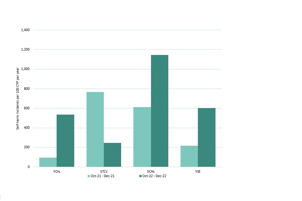 Rates of self-harm have shown different directions of travel across all three sectors of the CYPSE. The rate of self-harm at SCHs for the 3 months October to December 2022 was 1146 incidents per 100 CYP per year, this is an increase of 88% in comparison to the same period last year. STCs had a rate of self-harm of 247 per 100 CYP per year, a decrease of 68% in comparison to the same period last year. YOIs rate of self-harm was 535 per 100 CYP per year, an increase of 456% in comparison to the same period last year.