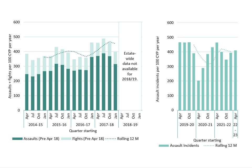 | Figure 1: Rate of assaults and fights by quarter - April 14 to March 18 | Figure 2: Rate of assault incidents per 100 CYP per year April 19 to June 2022 |
