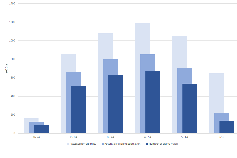 Around 83% of individuals who were assessed for potential eligibility were between the ages of 25 and 64, with around 90% of claimants from this age group. Take-up of the grant in these age-groups is at or above 76%. No one age group dominates and claims are evenly spread.