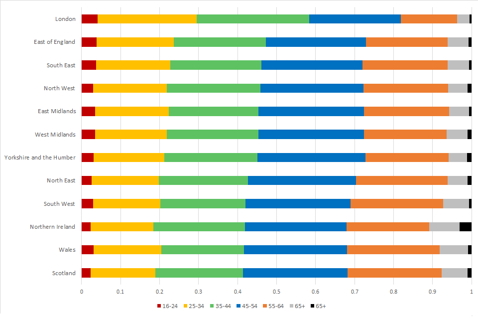 Between 41% (multiple areas) and 47% (East of England) of the potentially eligible population in each country and region is aged under 45 except in London where 58% are under 45.