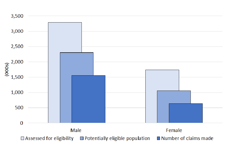 Of 5.0 million individuals who were assessed for potential eligibility, men make up around two-thirds (65%), and also make up a slightly higher proportion (68%) of the potentially eligible population.