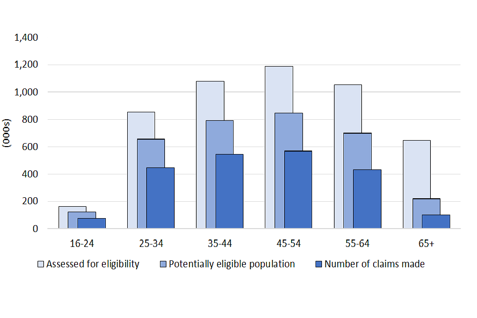 Around 89% of individuals who were assessed for potential eligibility were between the ages of 25 and 64, with over 91% of claimants coming from this age group. Take-up of the grant in these age-groups is at or above 67%, with the exception that those between 55 to 64 have a take up rate of 62%. No single age group dominates and claims are evenly spread.
