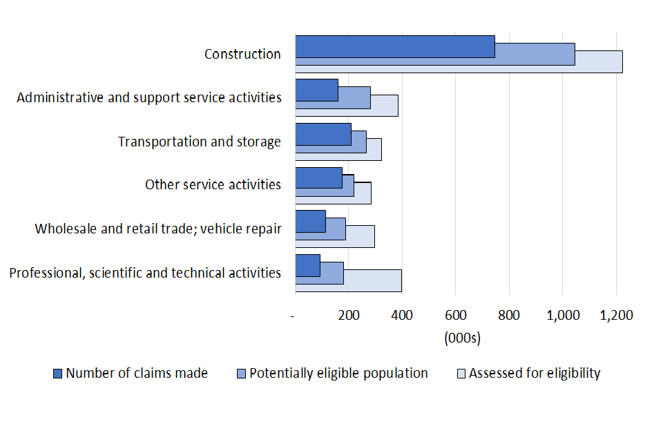 The construction industry has the largest population of individuals who were assessed for potential eligibility with over 1.2 million and just over 1 million of these were potentially eligible to apply. By 31 January construction workers had made 747,000 claims for Self-Employment Income Support Scheme totalling £2.6 billion; an average of £3,500 per claimant.