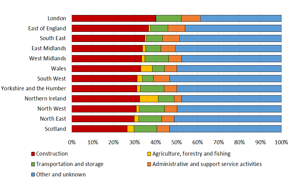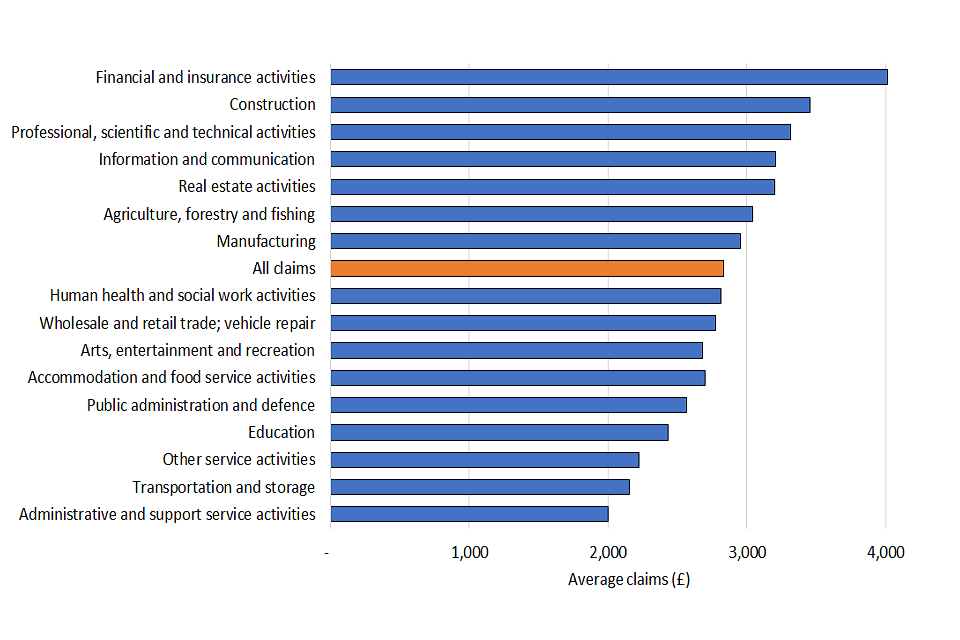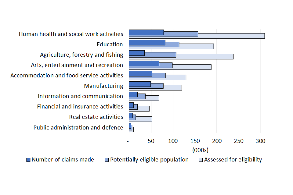 Self-employed individuals in the transportation and storage sector make up 8% of the potentially eligible population and made 209,000 claims totalling £450 million. Administrative and support services also make up 8% of the potentially eligible population and have made 161,000 claims totalling £322 million.