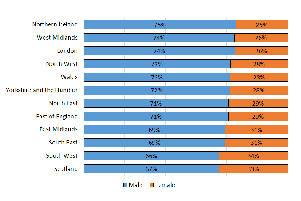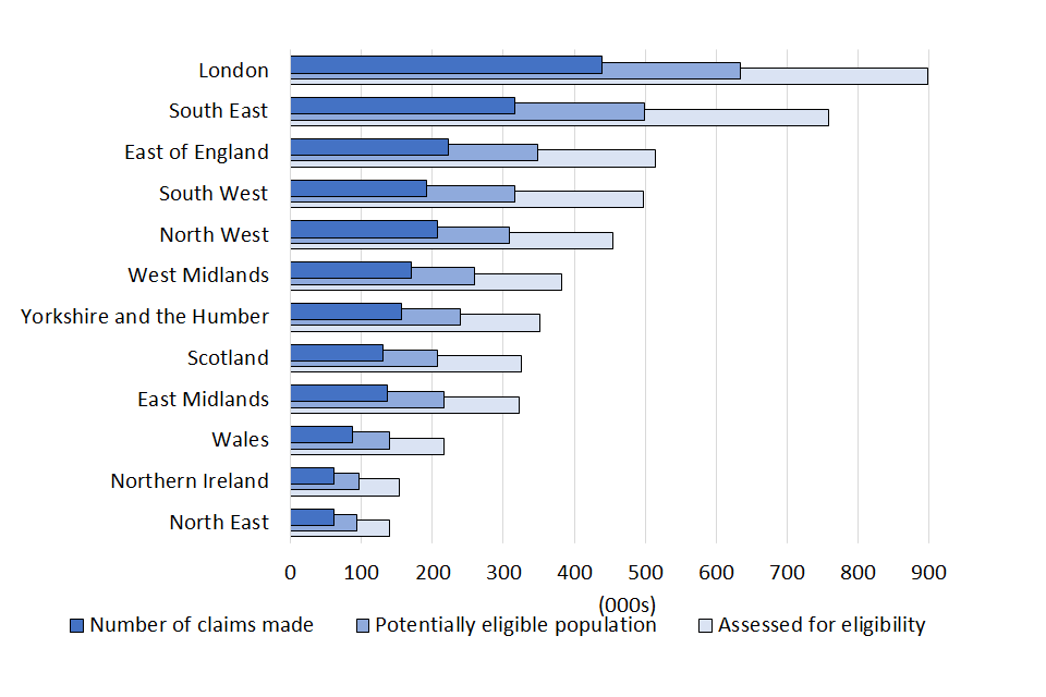 The area with the highest proportion of males in the potentially eligible population is Northern Ireland (73%) and the lowest areas are Scotland and the South West (65% each). A similar pattern is seen in the number of claims received by 31 Janaury with male claimants accounting for 75% of claims in Northern Ireland and 66% of claims in Scotland.