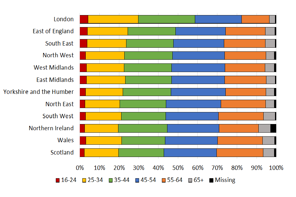 Between 41% (Wales, Scotland and Northern Ireland) and 48% (England) of the potentially eligible population in each country and region is aged under 45 except in London where 58% are under 45.